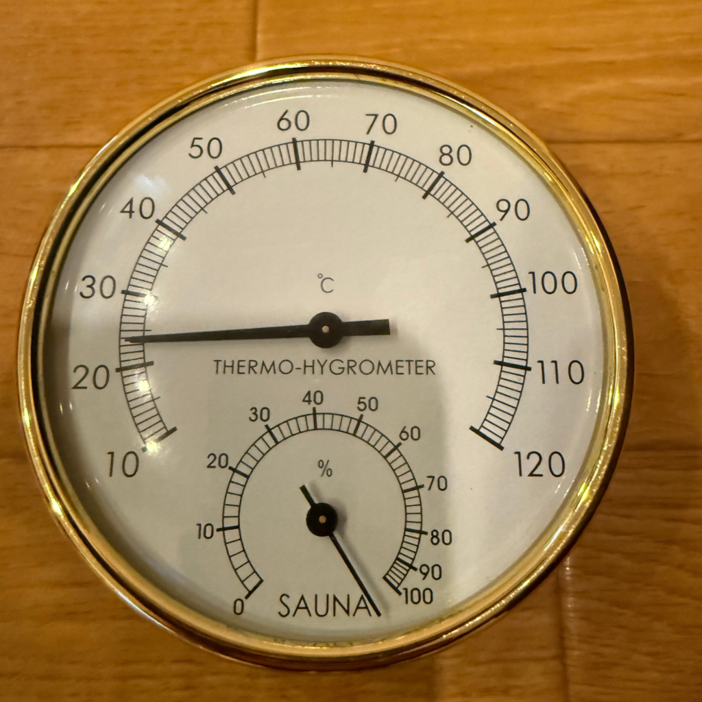 まさにサウナの温度計!というような可愛らしい温湿度計をテント内のポット内にセットしておきます。