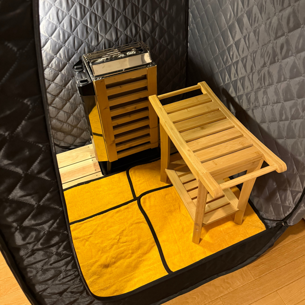 さらにサウナでよく見る「あのマット」を敷き、木製の椅子をセットするとこんな感じになります!
