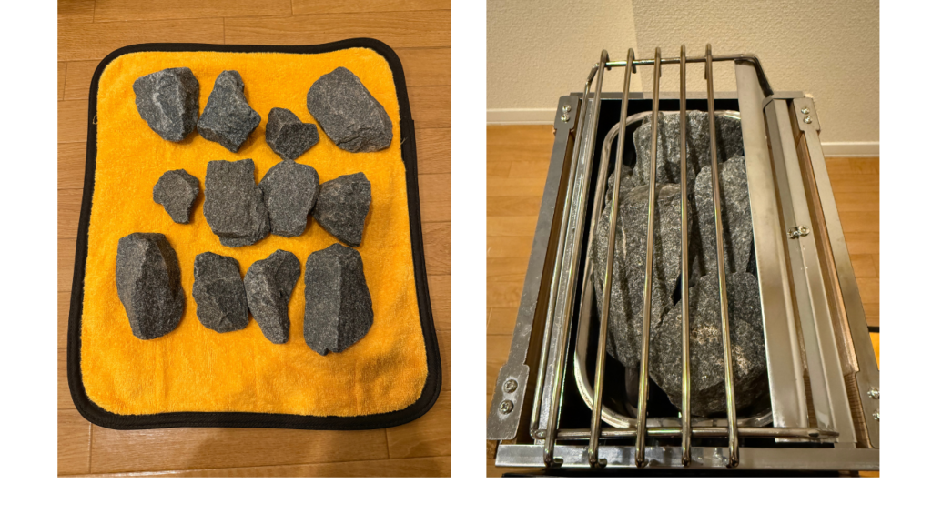 また、ストーブやサウナストーンを扱う際に手が汚れることがあるため、軍手を用意しておくと安心でした。